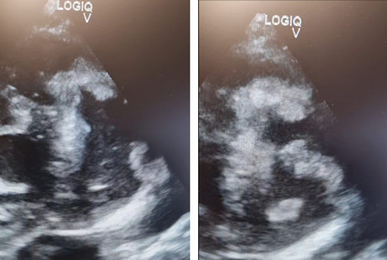 The ventricles are balanced. The patch placed on the defect in the perimembranous-outlet region in the interventricular septum was seen as echogenic, a left-to-right shunt from the 3mm residual defect at the upper end of the patch and a 38mmHg gradient between the two ventricles was detected large, lobulated echogenic and mobile mass was seen in the pulmonary valve. Measured 12-15mm in diameter. It was determined that it extended towards the right pulmonary artery with a thin pedicle and the length of the extension was 17mm. A 32mmHg gradient was measured at the valve level, and mild insufficiency was determined. There is degree 2 insufficiency of the tricuspid valve. Flow velocity was measured at 3.8m/s (58mmHg). RV pressure has been estimated at 60-65mmHg. The aortic valve has three cusps, with minimal regurgitation. There is mild (1st degree) regurgitation from the mitral valve. Thrombus/vegetation was not observed in other vessel cavities on tricuspid, mitral and aortic valves. Coronary artery outputs are normal. Left ventricular function is normal. RF about 65% here is no pericardial effusion (Figure 1 & 2).