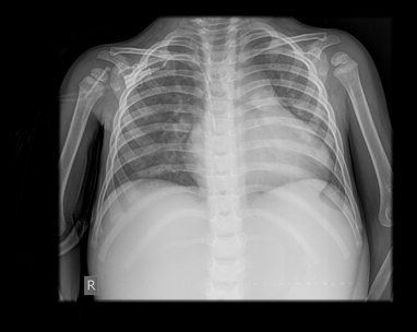 Figure 2 X ray-bronchovascular drawing emphasized right hiloperihilar and paracardiobasal with a field of plate-like small atelectasis.