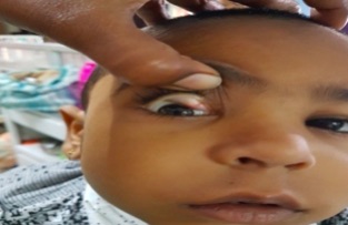 A 6 year old male child presented with history of swelling over right upper eyelid since last one month. Initially, the swelling started in the right upper eyelid and progressively increased involving the orbit resulting in proptosis of the right eye. There was also history of low grade fever since 1 month, which was not associated with chills and rigor, no diurnal variation and relived after taking medications. There was no history of gum bleeds, loss of vision, diplopia, skin bleeds, bone pains, or joint pains. He was fully immunized for his age. At admission, he was afebrile (98 °F), pulse was 86 beats/minute, blood pressure (BP) was 92/60 mmHg, and respiratory rate (RR) was 18 breaths/minute. Palpation of the right eyelid showed firm, immobile mass, located at upper medial orbital region (Figure 1). There were no other significant ophthalmic finding. Child had severe pallor with lymphadenopathy involving submental, supraclavicular, axillay and inguinal lymph nodes. On further examination, the lymph nodes were firm in consistency, non-tender, matted and immobile. Organomegaly was present. While the liver was just palpable, spleen could be palpated approximately 6 cm below the left costal margin. Testis was normal. Central nervous system (CNS) examination did not reveal any abnormality. Fundus examination was normal.