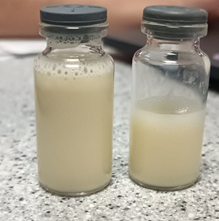 Extubation occurred 24 hours after birth, and enteral feeding commenced at 48 hours of life with expressed human milk, later transitioning to mixed feeding due to signs of abdominal distension. On day 40 of extrauterine life, abdominal circumference increased by 4 cm, leading to a further assessment with abdominal x-ray and ultrasound, reporting significant ascites. A subsequent paracentesis yielded 20 ml of milky fluid (Figure 2) (cloudy/milky cytochemical, glucose 102, proteins > 3000, leukocytes 264, mononuclear 98, polymorphonuclear 2, DHL 131, triglycerides > 525), confirming the diagnosis of chylous ascites. Exclusive feeding with a hydrolyzed breast milk substitute was initiated (TCM 55%).