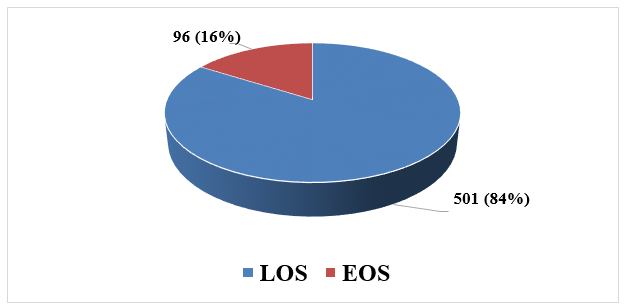 Diagnosis of sepsis based on onset shows that the majority (84%) was late-onset sepsis (LOS). (Figure 1)