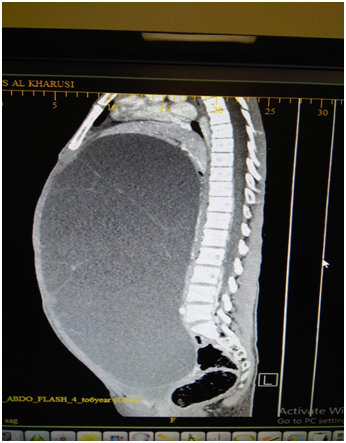 BA, a 12 years old girl was admitted through the ER, for inability to lie flat on the bed for approximately two weeks associated with some reduction in appetite in the preceding month. She had no bowel or urinary symptoms; and her LMP was on the day of presentation; with menarche 11months earlier. She denied any history of jaundice or bleeding disorder in the past. She weighed 39.7 KG, which was in the 3rd centile for her age. On examination she was not anemic and had no significant peripheral lymphadenopathy. Her abdomen was massively distended and one could not discern any organomegaly. The abdomen appeared fluid filled and was dull on percussion with minimal dilated veins on the abdominal wall. Investigations showed normal white cell count and ESR. The Serum AFP, Beta HCG, LDH and Liver function tests and renal function tests were normal. As the mass was not highly suspected to be ovarian in origin, a Ca 125 level or CEA level were not done at this stage. Next an US scan was done. This showed a giant fluid filled mass filling almost the entire abdomen, measuring over 38cms in the longitudinal axis and over 24cms in the transverse axis. The “cyst” was extending from pelvis to xiphi-sternum, compressing bowel loops and liver, moreover, appeared to show either loculation or septa. A clear “cyst” was not identified and the fluid filled mass was inseparably juxtaposed against the lower abdominal wall. The urinary bladder was seen partially filled. As an MRI scan was not immediately available, a CT scan with contrast was done (Figure 1 & 2).