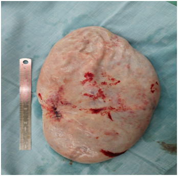 An MRI scan was done at this stage, in another hospital and this was reported as a probable right ovarian cyst with no solid component, no free fluid in the abdomen and all left fallopian tube, ovary and all other organs within normal limits. At this stage the patient was taken for laparotomy. A giant ovarian cyst was seen, attached to the abdominal wall, at the site of the pigtail drain. This part was isolated from abdominal cavity with multiple abdominal packs first. Next a double layer of purse string sutures were placed around the tube to avoid any fluid spill into the wound or abdominal cavity. A right salpingo-oophorectomy was done, after confirming that the opposite side ovary and tube were completely normal (Figure 3 ).