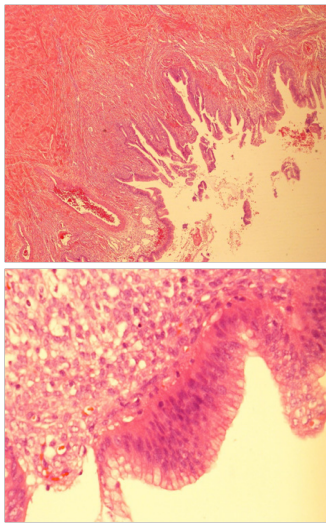 Figure 4 Histology low and high power field showing papillaroid mucosa lined by mucinous lining epithelium which show stratification and atypia.