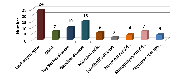 Among LSDs leukodystrophy was 24(30.38%), GM-1 7(8.86%), TaySaches disease 10(12.67%), Gaucher disease 15(18.99%), Niemann pick disease 6(7.59%), Sandhoff’s disease 2(2.53%), Neuronal ceroidlipofuscinoses 4(5.06%), Mucopolysaccharidosis 7(8.86%) and Glycogen storage disease 4(5.06%) (Figure 2).