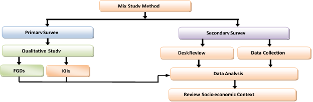 Study populations will select randomly in such a way so that each district contains most of the representation using the following formula for the quantitative method.