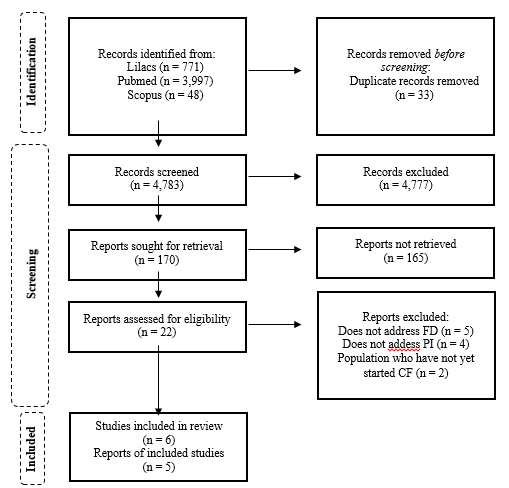 In this review, it was determined that the studies included were observational (cohort, cross-sectional, and case-control design), addressing FD as the outcome, found in the period of introduction food and/or CF of PI and published in Portuguese or English, published until March 2020. Exclusion criteria were not applied.