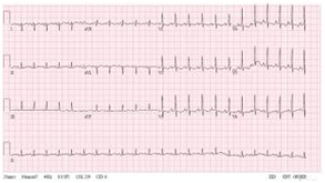 We attempted a third injection of Verapamil (0.25mg/kg) greater than the recommended schedule within the maximal total dosage limitation with a 20 min interval time. After a third injection of Verapamil, the Supraventricular tachycardia was slowly terminated with a heart rate decline to 178 beats per minute with a normal sinus rhythm (Figure 3A). However, 20 min later, the patient appeared lethargic with apnea and bradycardia with a heart rate of 87 beats per minute (Figure 3B). We immediately performed intubation with an oxygen supply, and administered intravenous calcium already prepared at his bedside that resulted in recovery to a hemodynamic stability with the normal sinus rhythm (Figure 4). Serial venous blood gas analyses revealed the following: initially, at pH 7.0, pCO2 78 mmHg, pO2 53 mmHg and HCO3 17.5 mM per liter; subsequently, at pH 7.35, pCO2 43 mmHg, pO2 47 mmHg and HCO3 23.9 mM per liter at FiO2 0.3. On chest X-ray after treatment, pulmonary congestion with mild cardiomegaly was revealed. After Verapamil therapy, his electrocardiogram mostly appeared as a normal sinus rhythm, and intermittent Supraventricular tachycardia recurred with clearly effective termination by adenosine injection. In addition, an intermittent recurrence of Supraventricular tachycardia was treated with oral amiodarone and oral propranolol. He exhibited no adverse effects with maintenance of oral amiodarone.