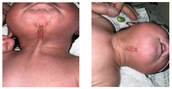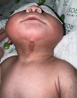 Full-term newborn, 38 weeks gestational age, 4 days old, born vaginally without complications, spontaneous neonatal adaptation, Apgar 8-9-10, Silverman Anderson 0 points, no respiratory distress, anthropometry weight 3,385 g height 50 cm, head perimeter 34.5 chest perimeter 33 abdominal perimeter 33, female sex, blood classification mother or positive newborn or positive, There was no family history of congenital defects and both parents were also healthy. On examination, a vertical mucous surface was observed in the midline on the anterior part of the neck extending from below the mental process of the mandible to the supra sternal area without skin cover. The defect was 3 cm vertically long and 0.5 cm wide. A nipple-like projection was observed at the top of the defect and there was a sinus at the bottom of the defect above the manubrium, so the patient was transferred to the neonatal intensive care unit at Clínica UROS for comprehensive management. The newborn remained in stable condition, thermodynamically compensated with cardiorespiratory sufficiency, with adequate respiratory pattern and saturations, without requiring supplemental oxygen. From a hemodynamic point of view, there was adequate distal perfusion with good urinary output. An echocardiogram was requested as a complementary study due to midline defects, reporting good left ventricular systolic and diastolic function, physiological tricuspid and pulmonary insufficiency, 3.3 mm oval fossa, 8 mm Tapse, without vegetations or ductus. From a gastrointestinal point of view, there was adequate suction and oral tolerance, with no difficulty sucking. Physical examination showed a cleft in the anterior midline of the neck, with no discharge, no infection, no induration. A thyroglossal cyst was ruled out. Further studies were required and a neck ultrasound was performed to exclude an association with other neck abnormalities. Echocardiography and abdominal ultrasound were normal and no other midline defect was found. After being assessed by pediatric surgery, the newborn was referred with a congenital neck injury, a midline cleft, a rare condition with no indication for emergency surgery, but with an indication for early treatment in life to avoid complications. Assessed by maxillofacial surgery considered a 3 cm vertical erythematous outline of possible closure of the central fissure in zone VI of the neck who maintains a search and suction reflex without complications, for which reason an outpatient control was indicated in 1 month by head and neck surgery. Pediatric neurology presents a 3 cm vertical erythematous outline, possible closure of the central fissure in zone VI of the neck, non-productive, non-transfixing, no secretions or bleeding, active, reactive, complete Moro ++, search reflex, palmar plantar prehesion ++ adequately mobilizes the 4 extremities. Due to findings on physical examination and high risk of neural tube malformation, a simple MRI of the cervical, thoracic and lumbosacral spine was indicated, which were performed without alterations. The otorhinolaryngological evaluation confirmed the diagnosis of isolated middle cervical cleft. A clinical follow-up was planned, which will be performed at 6 months of age. Surgical treatment with a Z-plasty will be planned before school age to allow for better extension of the neck and to ensure a functional and aesthetic result. Due to adequate clinical evolution, it is decided to discharge the patient in the company of his parents. Outpatient follow-up will be provided by an outpatient clinic. (Figures 1–3)