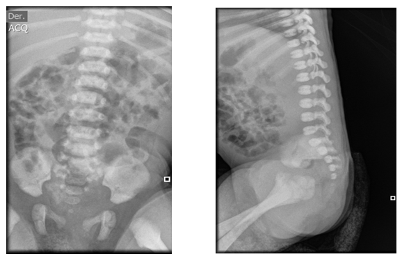 Figure 3 Lumbar spine x-ray technique: AP and lateral projection. Findings: There is no evidence of soft tissue alteration. The lumbar lordosis is preserved and the load-bearing spine is not displaced. The vertebral bodies have normal morphology, height and density according to the patient's age. The intersomatic spaces have normal width. The pedicles, spinous and transverse processes have normal morphology and density. The sacrum and coccyx have a normal anatomical position.