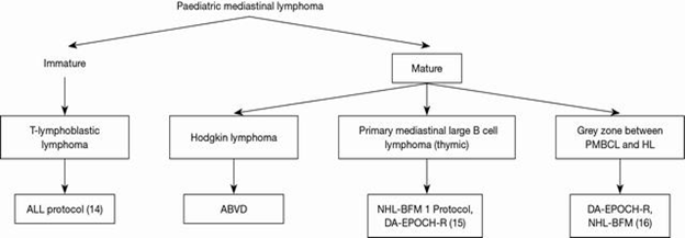 Figure 1 Common pediatric mediastinal lymphoma and Treatment protocols.18-20 PMBCL, primary mediastinal large B cell lymphoma; HL, Hodgkin lymphoma; ALL, acute lymphoblastic leukemia.
