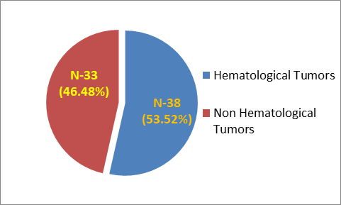 There were 71 cases having abnormal mediastinal masses detected on initial diagnostic workup on the chest radiology. Among them hematological malignancy were 38 case and non- hematological were 33 cases (Figure 2). Total pediatric tumors during the 5 years (2014-2018) were 2242. Total hematological tumors were 18.91 % (N-424) of total pediatric tumors. During the 5 years total lymphoma (HL &NHL) at PHO were 233, which were 54.95% of total pediatric hematological tumor and mediastinal lymphoma were 38 in number which were 16.30% of total lymphoma.