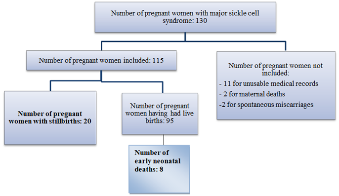 From January 1, 2015 to August 31, 2019, 130 pregnant women with sickle cell disease out of a total of 10,087 pregnant women admitted to the maternity ward of this hospital were recruited, representing a frequency of 1.3%. Among these pregnant women, 119 had usable medical records, but two pregnant women including a twin carrier had a spontaneous miscarriage and two others died during pregnancy. The study therefore involved 115 pregnant women (Figure 1).