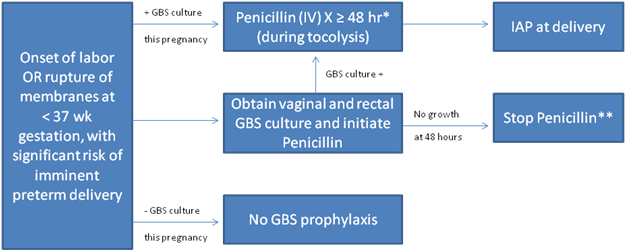 * Penicillin should be continued for a total of at least 48 hours, unless delivery occurs sooner. For women who are GBS culture positive, antibiotic.