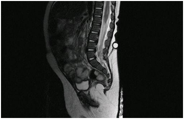 A 5-month-old infant that arrives to the pediatric emergency room (ER) with a chief complaint of fever of 12 hours (38ºC axillary), associated to vomits and irritability. A perinatological history of a pilonidal sinus within the center of a lumbosacral angioma detected at birth stands out, with an initial medullar ultra sonography that did not detect any communication. The rest of variables were within normal range. The physical exam revealed an angiomatous cutaneous lesion in the lumbosacral region L5-S1 with a pilonidal sinus and a hair follicle in the center of the lesion (Figure 1). Blood work showed WBC: 21300/mm3 (PMN 59%, Bands 3%, Lymphocytes 29%, Monocytes 9%), CRP: 143, 2mg/L and Procalcitonine: 2, 39ng/mL; VGB and the rest within the normal range. The CSF obtained was of purulent aspect, CSF cell count: WBC 8240/mm3 (PMN: 82%), CSF glucose: 0.18mg/dL, CSF protein: 0.86g/L, CSF gram stain: Gram negative bacillus, CSF culture grows an E. coli. Immunologic study without alterations. The patient was admitted and started treatment with cefotaxime (300 mg/kg/day),3 showing a clinical improvement within 6 hours of starting the treatment. The antibiotic was maintained for 22 days, with normalization of the CSF values by the end of the treatment.5 A new medullar ultrasound in the lumbosacral region was performed finding a hypoechoic tubular image starting form a hyperechoic subcutaneous nodular lesion in the sacral region that continues in depth into the sacral osseous elements. An MRI was then performed observing a fistula starting in the lumbosacral pilonidal sinus and continuing into the dura mater with a sacral osseous dysrafia (Figure 2). Within a month of discharge, and while waiting for the corrective neurosurgery, the patient presents with a new meningitis by E. coli, starting treatment again with cefotaxime (300mg/kg/day), receiving antibiotic treatment for 30 days in this second episode. A few days before ending the second course of antibiotics the surgical correction was successfully performed, with a resection of the cutaneomeningeal fistula and closure of the plains from skin to sacral meninges. Following the surgery, the infant has remained asymptomatic and has not presented any complications or new infections.