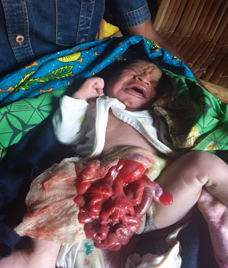 At birth the baby presented abdominal wall abnormalities with open-tissue without skin and sub-cutaneous tissue. It was a severe laparoschisis. On the following day, the newborn was referred to Gemena referral Hospital for adequate care. On the same day one, the baby health conditions were deteriorated with fever, not well breastfeeding with symptoms of acute respiratory distress, He was treated for possibility of severe bacterial infection with intravenous gentamycin and ceftriaxone and a daily healing chlorine solution. Unfortunately, the baby passed away on April 11, 2021-day three of the admission, at Gemena referral hospital (Figure 1).