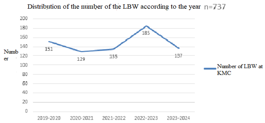 The collection of data from different sources and the analysis of these data enabled us to note the following epidemiological data: During the study period, five thousand seven hundred and thirty-five (5735) newborns were hospitalised, including 1505 (26.24%) low birth weight (LBW) in the neonatology unit of Treichville Teaching Hospital. Of these LBWs, 737 were admitted to the kangaroo subunit, i.e. 55.1% of LBWs admitted to the paediatric ward during the 5-year study period, with a peak in 2022 (185 LBWs) (Figure 1).