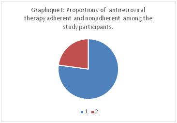 Adherence to the antiretroviral therapy is crucial to reach the 90 90 90 objectives operationalized in South Ubangi province. While HIV was still making victims in the semi and rural areas in this province, availability and accessibility to HIV services have been made possible with the assistance of the global community and different stakeholders. The national response to this epidemic has consisted in setting a coordination to evolve standards and operational plans to manage the epidemic. Gemena referral Hospital covered an estimated total population of 347 029 people in 2018. From the national statistics, the proportion of people whose HIV+ status is known is 1.03 %. Therefore the expected number of HIV patients in Gemena Referral Hospital should be 3574 patients. The known number of Persons living with HIV was 1252 patients, among the former, 1080 were taking the ARVs drugs in 2018. Among the former, 27 patients were reported dead and 16 lost to follow up, while 8 were taking the second line of ARVs. Unfortunately to our knowledge, no previous study in the context was made to reliably document the extend of and factors associated with adherence among people using ARV services in this facility. Adherence is described as the engagement and accurate participation of an informed patient in a plan of care.1 The concept of ‘adherence’ has a broader meaning than compliance. It encompasses the extent to which a patient follows instructions and implies understanding, consent and partnership through a continuing care plan.2–7