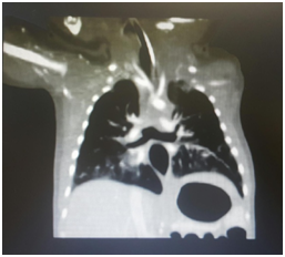 At day three of life, patient was transferred to our hospital for further management. Patient was kept on CMV mode with persistence of his CO2 retention. Echocardiography done showed ASD Ostium Secundum 8mm with left to right shunt and pulmonary hypertension (PAP=30mmHg). A bedside Fibroscopy was done revealing a blunted end suspecting tracheal agenesis. Computerized tomography scan (CT scan) confirmed the diagnosis of tracheal agenesis: the trachea extends for a distance of 1cm after which it completely obliterates. A fistula connecting the larynx and the esophagus at the level of the vocal cords and another fistula separating the esophagus and the carina were noted (Figure 1).