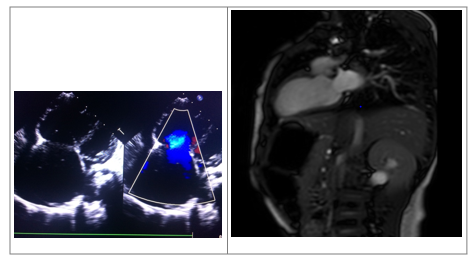Case 2: 2 years old apparently asymptomatic boy was referred to us with an incidental murmur. On examination his vitals were normal with HR: 98/mins regular, RR-20/min, BP: 102/64 mm Hg, saturation in room air: 94%. Apex was in the 5th intercostal space 1 cm lateral to the midclavicular line. The first heart sound was normal in intensity and duration and the second heart sound was normal in intensity with normal splitting. A soft systolic murmur was present at the left lower sternal border. CXR showed mild cardiomegaly. Echocardiography showed dilated RA and RV with severe tricuspid regurgitation and right ventricular dysfunction. A diagnosis of organic TR was made, diuretics were started and the child was under follow up. The child developed features of congestive heart failure. CMR (cardiac magnetic resonance) imaging was done which showed dilated RA, RV with thinned out RV wall with- out any fatty infiltration of the RV wall, suggesting Uhl’s anomaly (Figure 2). Parents were in- formed about the condition and prognosis and they too preferred medical management over the palliative surgical procedure.
