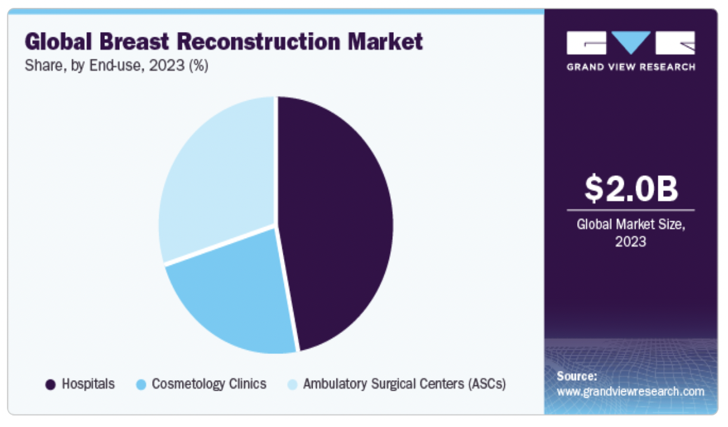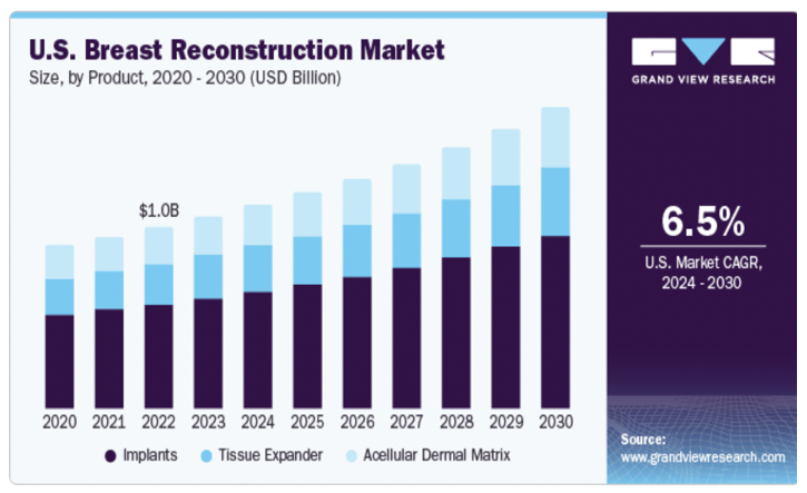 The global breast reconstruction market was valued at approximately USD 2.0 billion in 2023 and is projected to grow at a compound annual growth rate (CAGR) of 6.54% from 2024 to 2030 (Figure 2). This growth is driven by several factors, including the increasing incidence of breast cancer, favorable reimbursement policies, and advancements in surgical techniques.