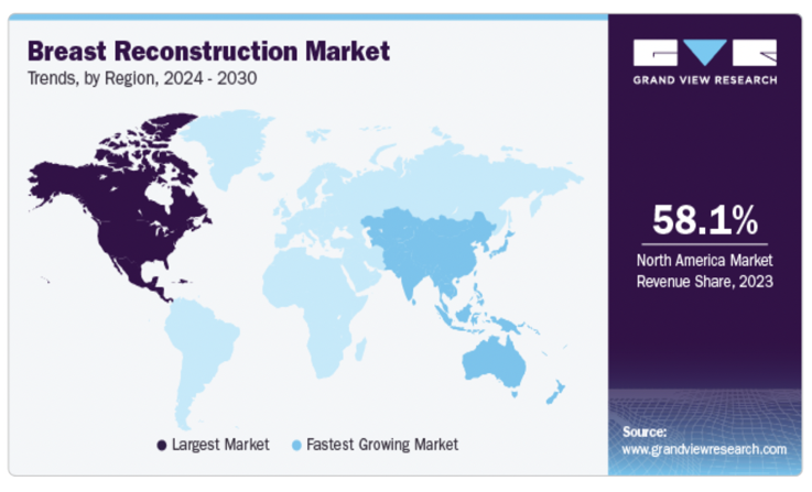 Regionally, North America dominated the market with a 58.09% revenue share in 2023, owing to the rising number of breast cancer cases and well-established healthcare infrastructure. Asia Pacific is projected to register a CAGR of 6.91% from 2024 to 2030 (Figure 2), driven by the rapidly increasing number of breast cancer cases and growing awareness about breast reconstruction surgeries.