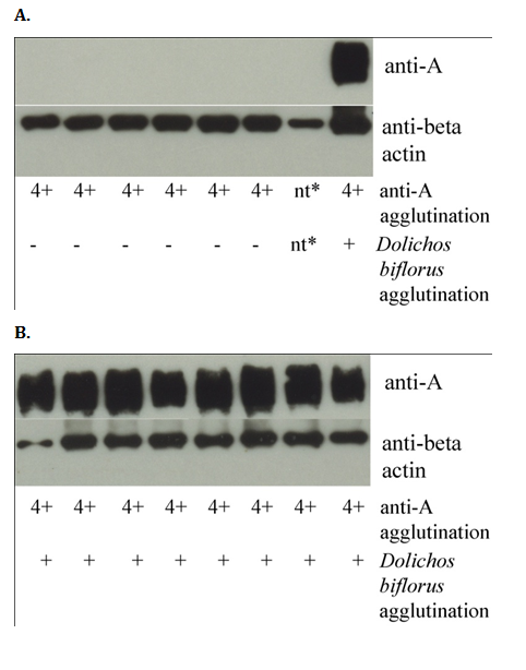 Figure 2 Western blots of erythrocyte membranes probed for A antigen and beta actin. A) A minority of solubilized group A erythrocyte membranes do not yield protein bands when probed with A antibody (middle lane). Cells from these donors did not react with Dolichos biflorus but reacted strongly with A antibody by tube hemagglutination, indicating that they are A2 cells. In contrast, the housekeeping gene beta actin was strongly expressed in all donors. A single A1 donor was run as a positive control in the far right lane. Commercially available A2 reagent cells (second lane from right) were indistinguishable from the donor A2 erythrocytes. B) In contrast, multiple A1 donors yield protein bands when probed with antibody to blood group A antigen (all lanes).