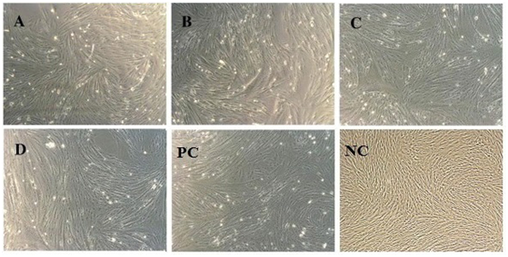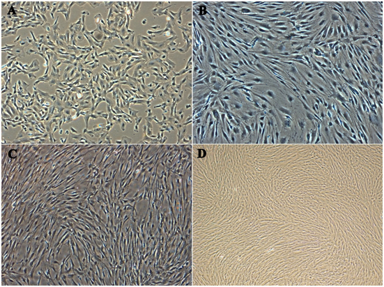 Figure 1 Morphological analysis of Multipotent Stromal Cells. The growth of the cells after 24 hours of incubation at passage 10, at which time the cells were mostly fibroblast-like cells in shape. Comparison of the morphology: (A) Amniotic membrane, (B) Wharton’s jelly, (C) Villous Chorion, (D) Complete confluence growth of pooled cells as test control respectively (Magnification 10X).