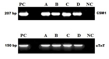Total RNA was extracted by TriZol RNA Extraction Kit (Invitrogen, USA) from differentiated cells, non-differentiated MSCs were used as negative control. Reverse transcriptase PCR of genes of cardiac transcription factors including CSM1 and cTnT were performed using 0.1ug of total RNA. The reverse- transcribed cDNAs were amplified by PCR using following oligonucleotide Primers: (a) CSM1: Forward: 5’-TGATGGAATACCGACACCAGA-3’, Reverse: 5’-GGTAGGTGGCAATCTCCACA-3’, (b) Cardiac Troponin (cTnT): Forward: 5′-GGCAGCGGAAGAGGATGCTGAA-3′ Reverse: 5′-GAGGCACCAAGTTGGGCATGAACGA-3′. cDNA was synthesized by rt-PCR kit (Quiagen, Germany). Thermal profile used for PCR was 94°C for 2 minutes followed by 35 cycles of 30 seconds at 94°C, with 30seconds annealing followed by 1-minute extension at 72°C. Additional 10 minutes’ incubation at 72°C was included after the last cycle. PCR products were size fractionated by electrophoresis using 1% agarose gel for Cardiac Markers.