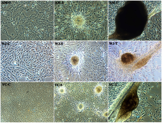 Figure 5 In-vitro Tube formation of representative fetal sources Amniotic membrane (AM), Wharton’s jelly (WJ) and Villous Chorion (VC). No changes in the control (C) and alignment of cells started one-hour post incubation in a Spheroid form (S), Extensive network formation / Tubule formation post-three-hour incubation (T) respectively (Magnification 10X).