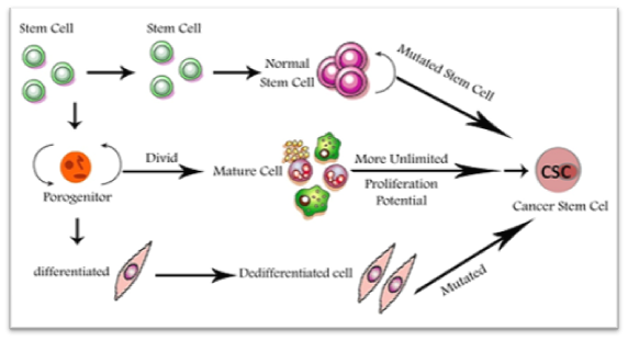 Though CSCs have properties similar to normal stem cells, but, it is not obvious whether CSC arise through the transformation from conversion of cancer cells to undifferentiated stem-like cells or multipotent adult stem cells. CSC represents an important target in cancer treatment for killing cancer cells or preventing cancer recurrence because these cells have been recognized as tumor-initiating cells (TICs) or tumorigenic cells.8