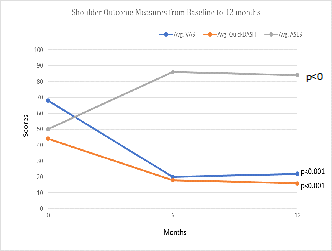 Figure 1 Patient progress versus time after BMC injection into the Shoulder: Average (Avg.) QD = quickDASH, a measure of shoulder function with lower scores being ideal. ASES = American Shoulder and Elbow Surgeons – Shoulder score, measures shoulder function also (and includes a physician assessed component), Higher percentages are better scores. VAS = Visual Analog Scale scores – Higher scores indicate higher pain, p<0.001