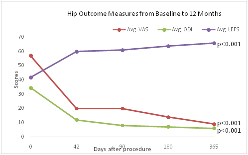 VAS: Visual Analog Scale scores – Higher scores indicate higher pain; Average ODI: Oswestry Disability Index; Average LEFS: Lower Extremity Functional Scale, p<0.001.
