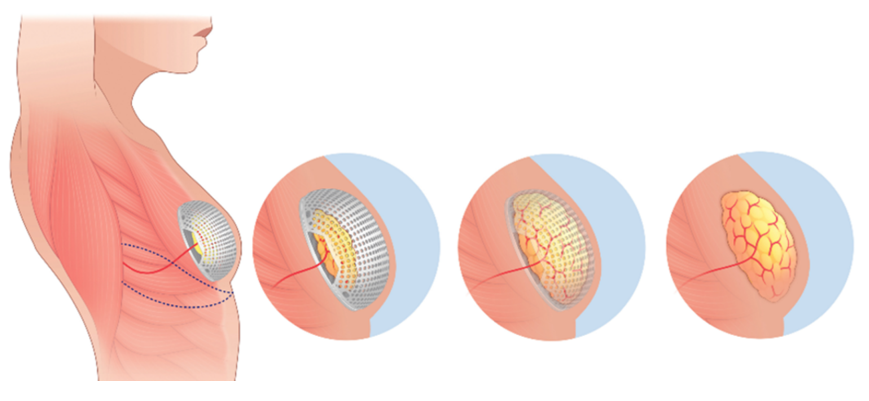 Image of a PCL-based scaffold seeded with adipose tissue for regenerative breast reconstruction. The structure is designed to degrade as native tissue grows.