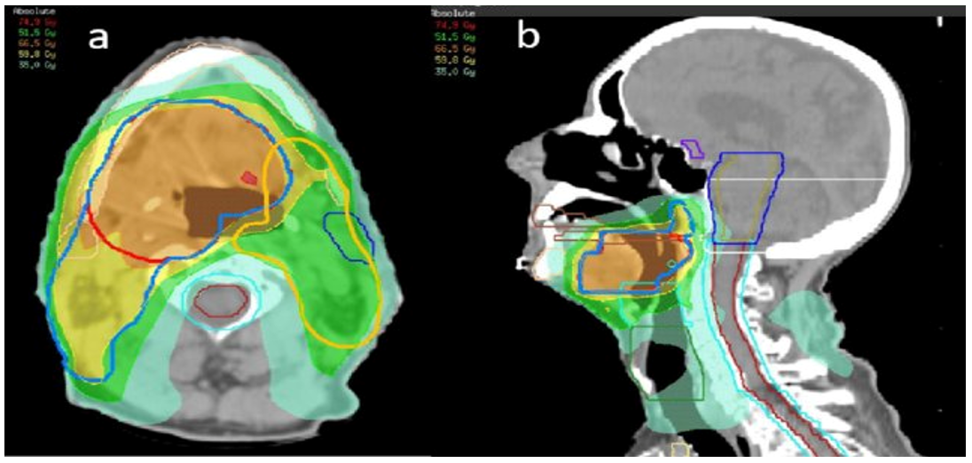 Tumor volumes including the gross tumor volume (GTV), clinical target volume (CTV), and planning target volume (PTV) were outlined following institutional guidelines. Organs at risk (OARs), including both parotid glands, the spinal cord, and brainstem, were delineated on the planning CT by an experienced radiation oncologist. IMRT used to administer a total dose of 66Gy in 33 fractions to the PTV.