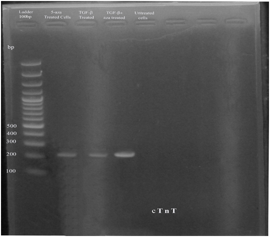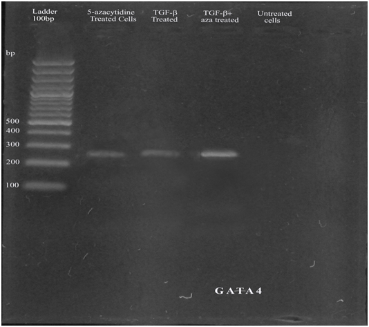 It is accepted that demethylation began by 5-azacytidine enhance the expression of many genes. In the current study it was observed that cardiac specific genes (TNT, GATA4) were highly expressed in all treated bone marrow derived MSCs. These pro play a significant Part in the manner of induced differentiation. Bone marrow derived MSCs treated with 5-azacytidine resulted in differentiation of bone marrow derived MSCs into cardiomyocytes by expressing cardiac specific genes. Thus they have the ability to replace injured cardiac cells in heart attack.27