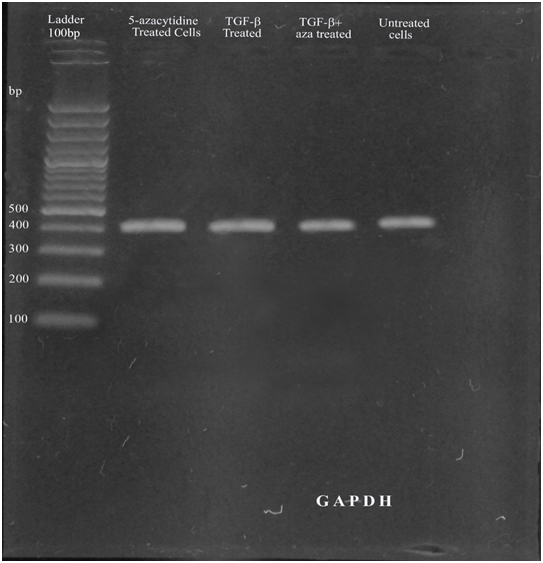 The expression of cardiac specific genes GATA4 and cTnT were studied at mRNA level by RT-PCR. GATA4 and cTnT cardiac specific genes were expressed in all treated cells. The GATA4 and cTnT was highly expressed in combined treated cells (aza+mTGF-β) as shown in group 3. The cardiac specific markers were not expressed in untreated cells (Figure 2A & 2B). GAPDH was used as control as shown in Figure 2C.