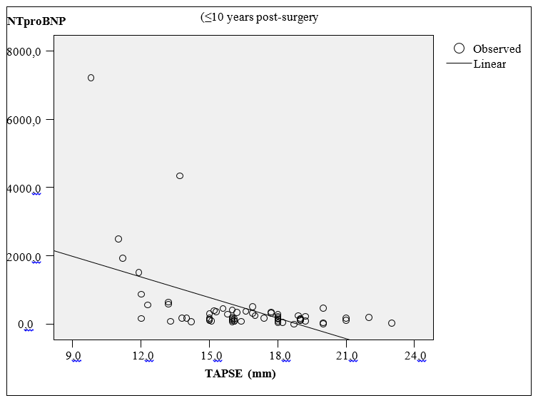 Our findings align with studies by Valente et al.,1 and Geva et al,2 confirming the progressive loss of sensitivity of NT-proBNP in detecting RV dysfunction beyond the first decade after surgery. This may reflect compensatory mechanisms or myocardial remodeling. In early follow-up, NT-proBNP correlates well with TTE indices such as TAPSE and RV FAC, in agreement with ESC guidelines on adult congenital heart disease follow-up. Notably, TAI index remains associated with NT-proBNP even in the late period, suggesting its sensitivity to subclinical dysfunction. Similar trends were observed in studies evaluating late postoperative follow-up after tetralogy of Fallot repair.3-5