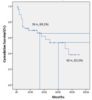 The mean follows up time was 38.1 months (range: 3-90 months), distant relapse presented in 31 patients (64.5%), being lung the most frequent site of relapse (23 patients). The mean recurrence free survival was 25.6 months (range: 0-90 months), and the mean overall survival was 31.4 months (range: 2-90 months). 3 and 5-year survival was 69.2% and 53.5%, respectively (Figure 2). Of the studied cohort, 20 patients (41.7%) died during follow up.