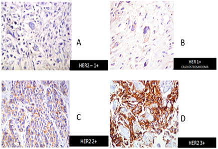 Figure 2 Immunohistochemistry HER2 detection in our patients. A) HER2-1+, B) HER1+, C) HER2+, D) HER2 3+.