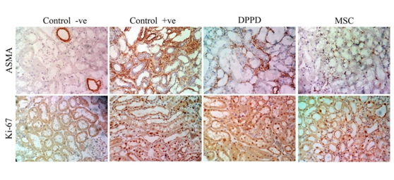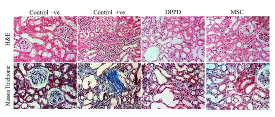 Conclusion: Both MSCs and antioxidant (DPPD) were found to have potent potentials to inhibit tubulointerstitial fibrosis in cisplatin induced nephrotoxicity rat model.