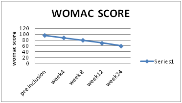 Figure 1 showed the variation in the WOMAC scores, which decreased significantly week 4 onwards, for all the three parameters Pain, Stiffness and Physical disability. The difference got more significant as the trial progressed from week 4, week 8, week 12 and the follow up period of week-24.
