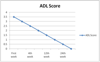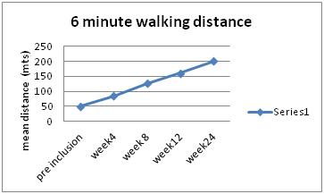Figure 2 showed significant change in the distance walked in 6 minutes. This was consistent as after continuous exercise (continuous walking for 6 minutes), increase in the vital parameters was natural and physiological. Figure4 showed changes in ADL scores Figure 3.