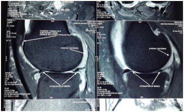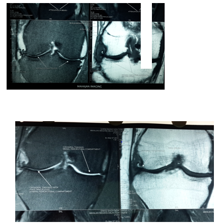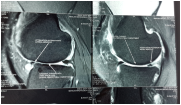Biochemical test showed decreased level of ESR, CRP and Rheumatoid Titer. X-rays showed less Osteopenia. MRI of knee showed increased thickness in articular cartilage with reduction in synovial thickening and joint effusion. There was visible repair of articular cartilage breach Figures (4-6B).