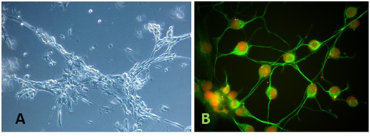 Figure 1 Microphotograph of mesenchymal stem cells (MSCs) after 24h of cultured in neuro-induction medium. A) Light microphotography of MSCs induced cell showing structural changes (10X). B) Immunofluorescence microscopy of MSCs cultured in neuro-induction medium. Glial fibrillary acid protein (GFAP) detection (green). Nuclei are counterstained with propidium iodide (red).