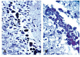 Figure 3 Histological image of a rat brain from the medial forebrain bundle to the 600 µm sagittal line. (A) Mesenchymal transplanted cells were detected by an antibody (Ab) to BrdU-peroxidase (brown; 10 X). (B) Histological image of rat brain from the medial forebrain bundle to the 600 µm sagittal line (40 X). Transplanted pre-differentiate cells were detected by anti-BrdU Ab.