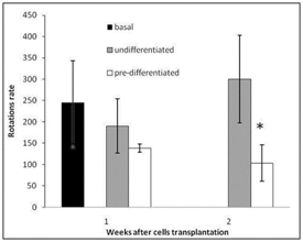 To determine any possible beneficial effect of undifferentiated or dopamine neuron precursor cells transplantation, rotational behavior was determined at 1 and 2weeks after transplantation by intraperitoneal injection of 0.5mg/kg apomorphine in 0.9% ascorbic acid solution6 (Sigma-Aldrich). The number of rotations made by each rat was counted for 90min, beginning 10 min after the injection. Differences in number of rotations between groups were analyzed by the T-student test.