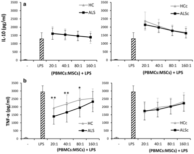 Figure 1 Comparison of cytokine levels between ALS patients treated with ALS MSCs (ALS) or healthy MSCs (HC) in PBMC culture. All cultures stimulated by LPS. Cytokine levels measured by ELISA. Asterisks indicate significant difference (* = p<.05, ** = p<.01).