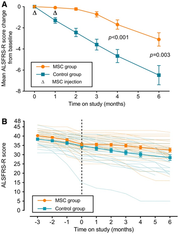 Figure 2 ALSFRS-R scores among MSC treated and control groups. (A) Change from mean ALSFRS-R score (B) Mean ALSFRS-R score for each group over the course of the whole study.47