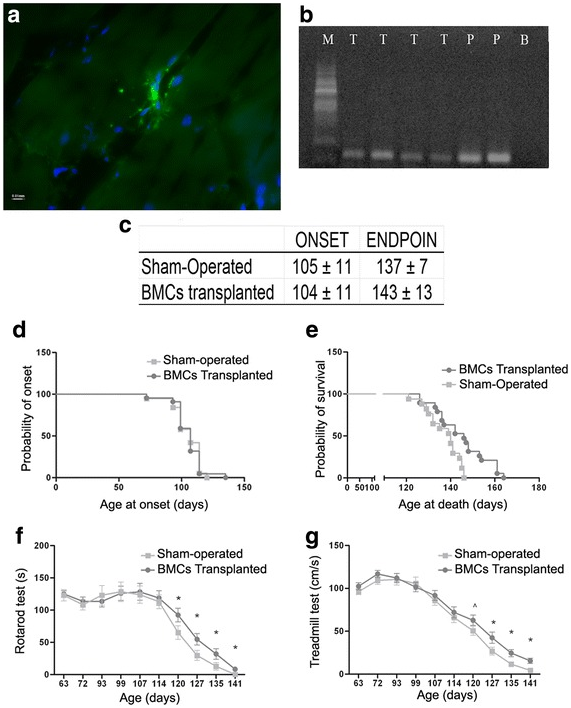 Figure 3 Effect of BMC transplantation into skeletal muscle of ALS transgenic SOD1G93A mice. A) Section of quadriceps femoris stained for GFP cells (green) and nuclei (blue). B) Electrophoresis of quadriceps tissue for the detection of GFP expression after BMC transplantation (T treated mice, P GFP cells used as positive control, B Black control, M RNA Marker). C) Days to disease onset and disease endpoint in both vehicle (sham-injected) and transplantation groups. D) Probability of disease onset as a function of age. E) Probability of survival as a function of age. F) Time to failure in rotarod test as a function of age. G) Maximum speed measured by the treadmill. n = 20 animals in each group. ^p < 0.10; *p < 0.05. Error bars indicate SEM.52